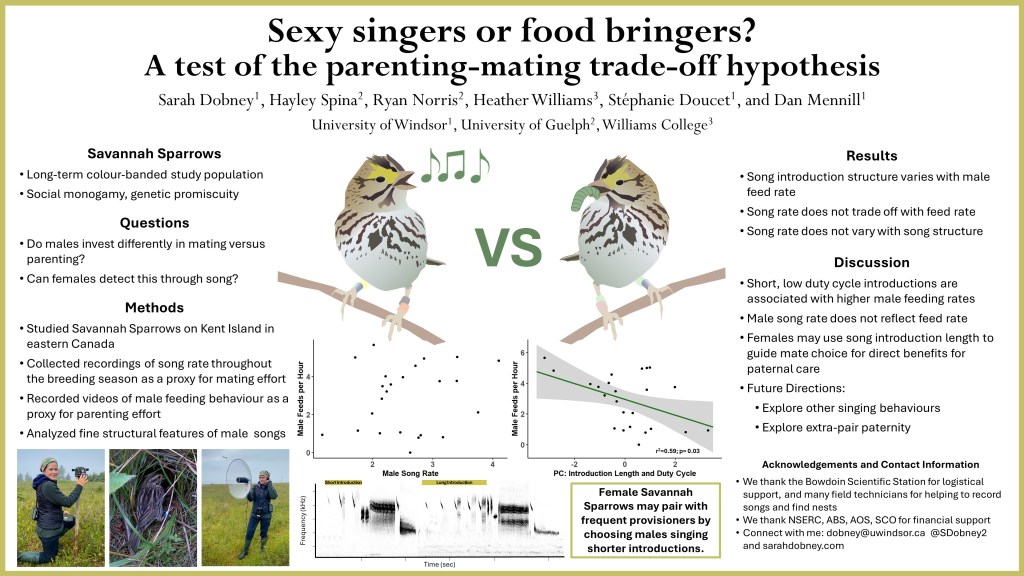 - DOBNEY SL, Bornais M, Norris R, Newman A, Doucet S, Williams H, Mennill D (2023) AOS/SCO Conference.